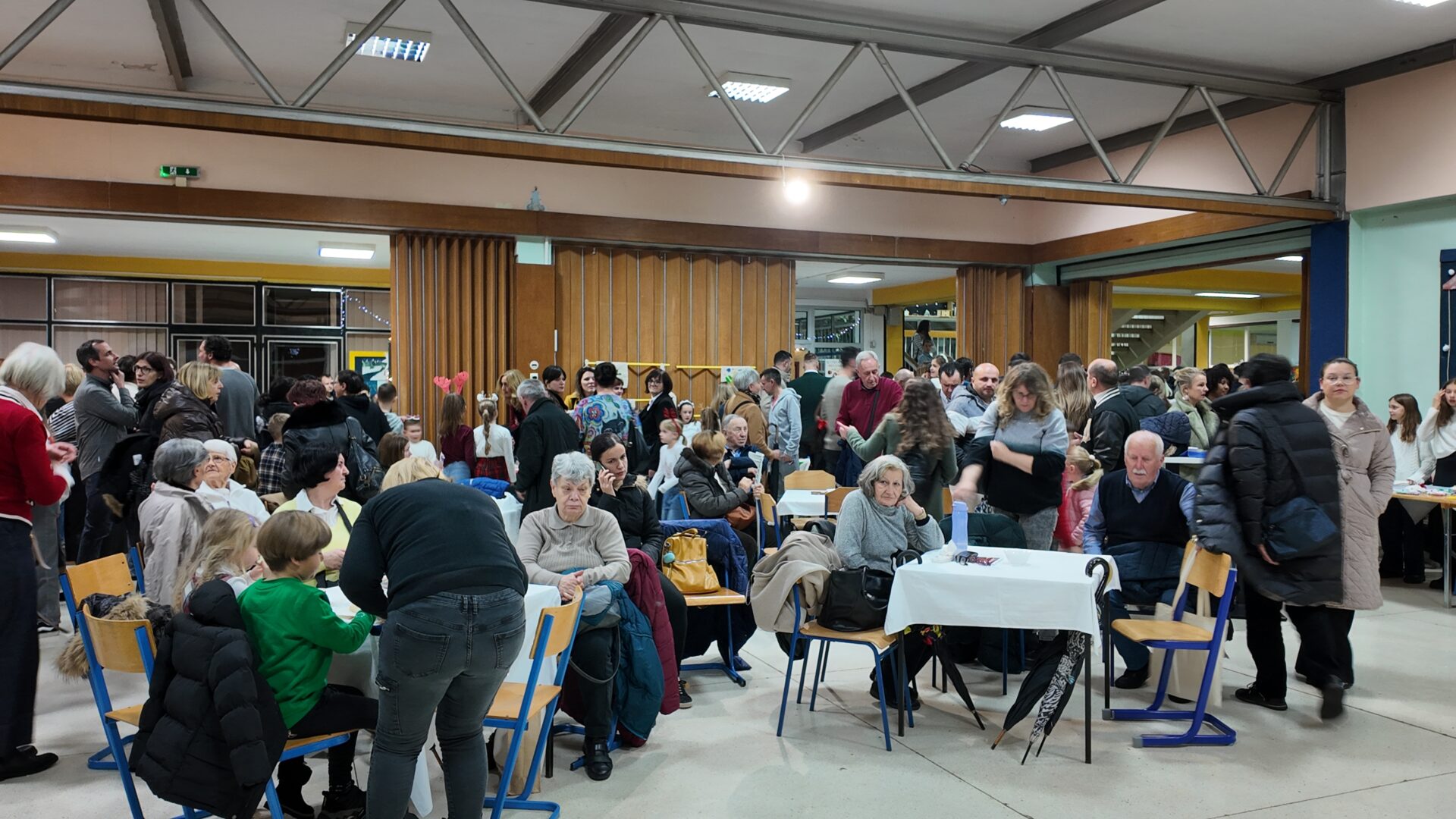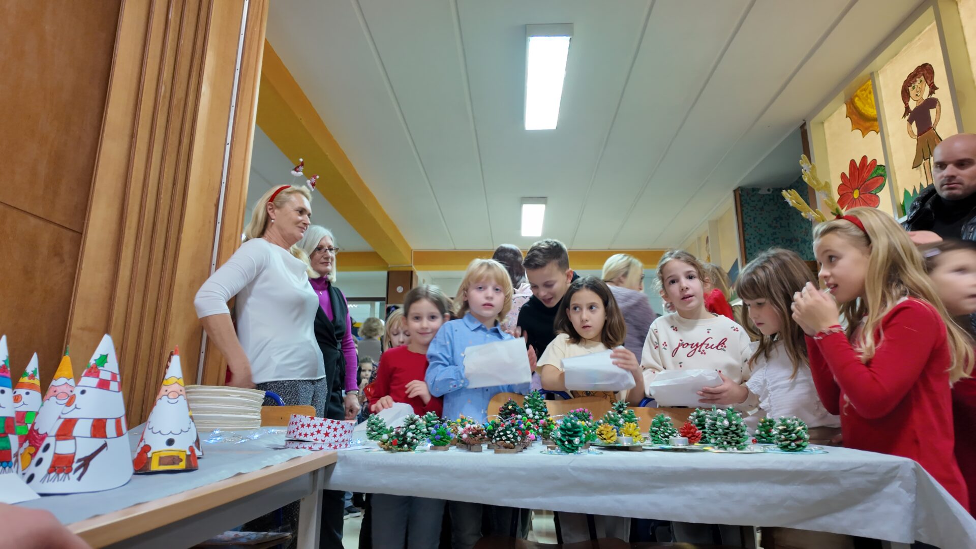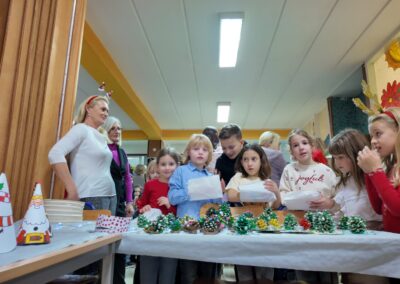 Program je započeo u 17 sati nastupom učenika 3.a i 3.b razreda koji su uprizorili jaslice i podsjetili nas na pravu bit Božića pjesmama “Vratite nam malog Isusa” i “Božić je vrijeme od ljubavi”. Školski zbor je svojim glasovima uveličao početak sajma izvodeći tradicionalne skladbe poput “Visom leteć”, “Sveti Nikola” i nezaobilaznu “Radujte se narodi”. Najmlađi, učenici 1.a i 1.b razreda, raznježili su publiku izvedbama uz pjesme “Pahuljica” i “Trepak”.